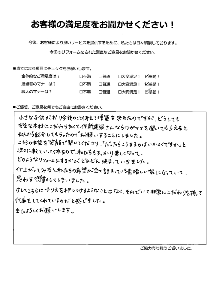 小さな子供がおり今後のことも考えて増築を決めたのですが、どうしても安全な木材にこだわりたくて、作新建装さんならワガママを聞いてくれると知人から紹介してもらったのでお願いすることにしました。