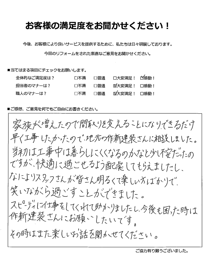 家族が増えたので間取りを変えることになり、できるだけ早く工事したかったので、地元の作新建装さんに相談しました。